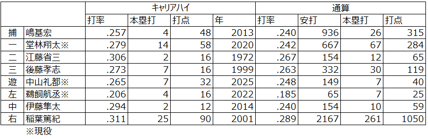 いかがでしょうか。 まず目を引くのは、通算2167安打で名球会入りを果たしている稲葉篤紀選手と、楽天の日本一を正捕手として牽引した嶋基宏選手の存在です。この二人は間違いなく球界を代表する一流選手です。