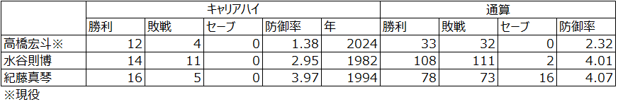 特筆すべきは、現在進行形で球界を無双している高橋宏斗投手の存在です。キャリアハイとして挙げた2024年の「防御率1.38」という数字は、現代野球において異次元の成績と言えます。 さらに、通算108勝を挙げた水谷則博投手、キャリアハイで16勝をマークした紀藤真琴投手と、先発ローテーションを任せられる確かな実績を持った投手たちが揃っています。