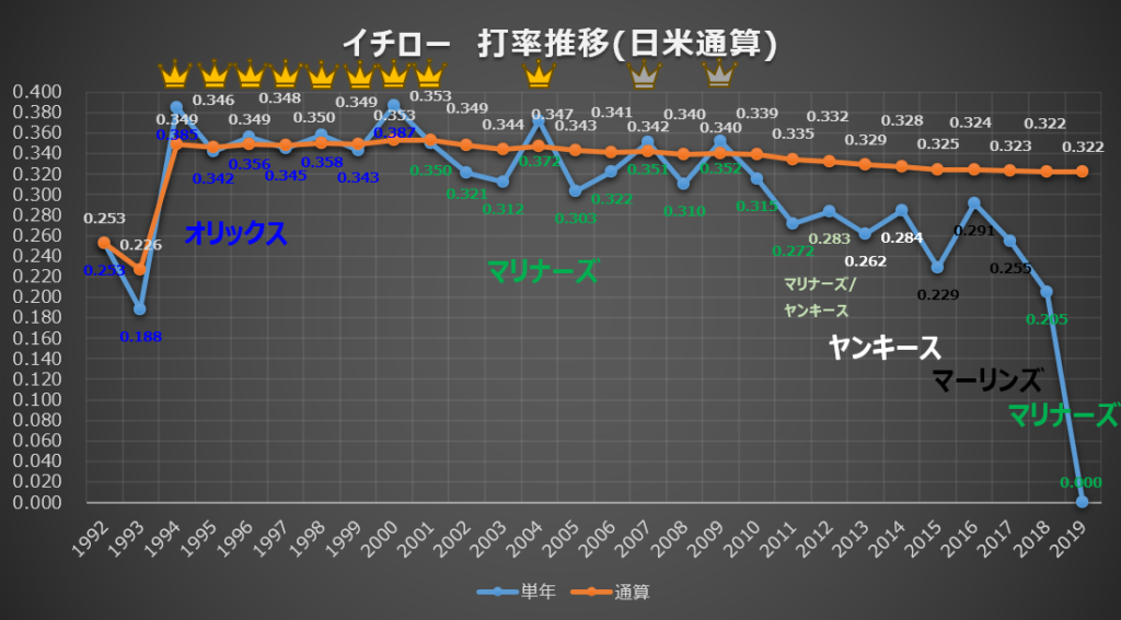 膨大な打席数を重ねる中で、過去の高いアベレージを維持することは、レジェンドであるイチロー氏にとっても至難の業だということがデータから読み取れます。