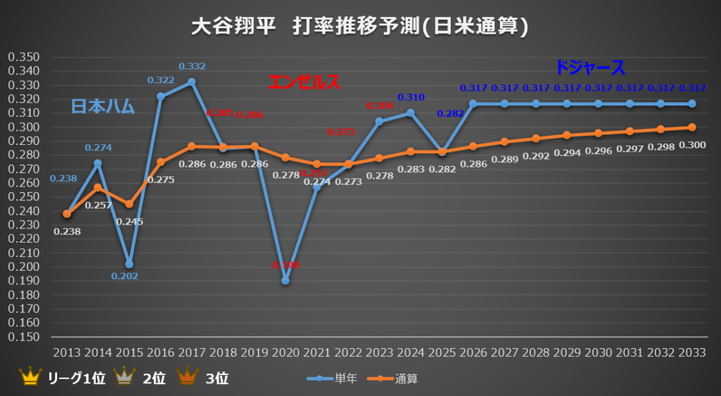 大谷選手の通算打率が近年「右肩上がり」であることを確認したところで、一つの究極の目標が浮かんできます。それは、超一流打者の証とも言える「日米通算打率3割」という大台です。