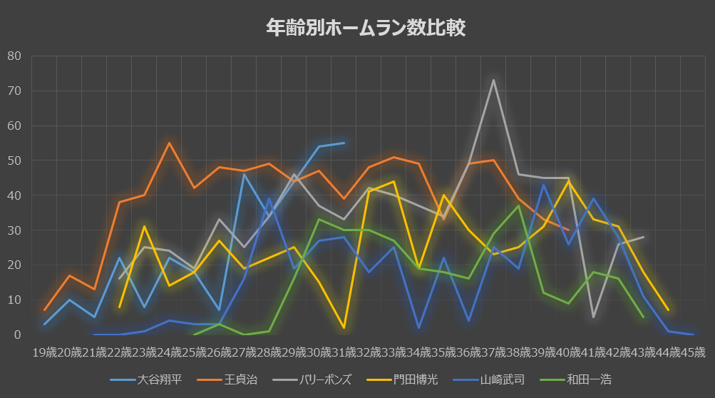 現在、水色のグラフの最先端(30代前半)で驚異的なペースでホームランを量産している大谷翔平選手。彼がこの先どのような放物線を描いていくのか。 ここからは、これら5名のレジェンド一人ひとりの推移と大谷選手のデータを個別に比較し、さらに深く考察していきます。