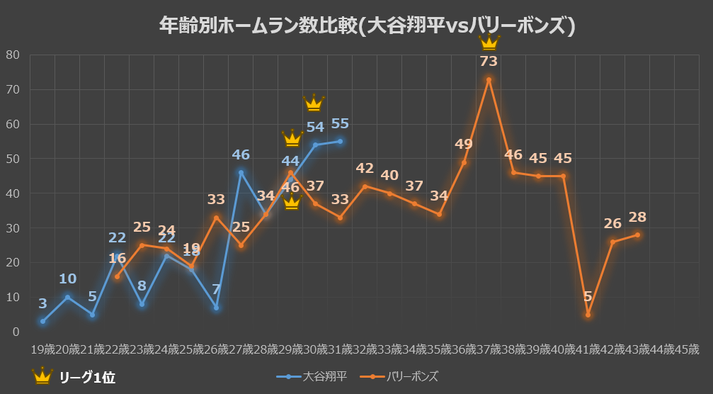 グレーの折れ線(ボンズ氏)と水色の折れ線(大谷選手)を重ね合わせると、非常に興味深い事実が浮かび上がってきます。