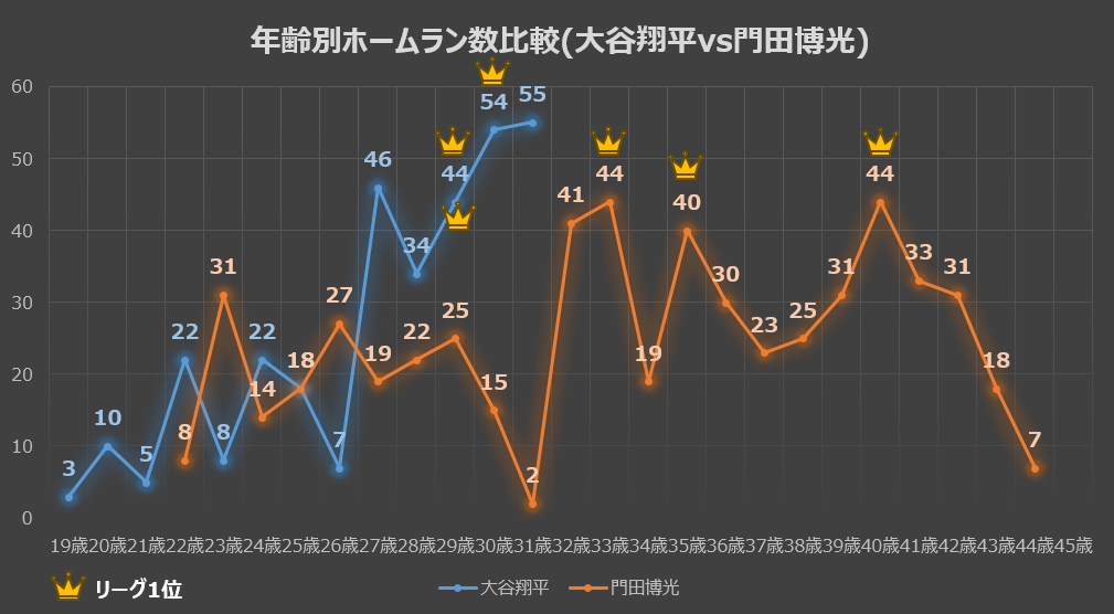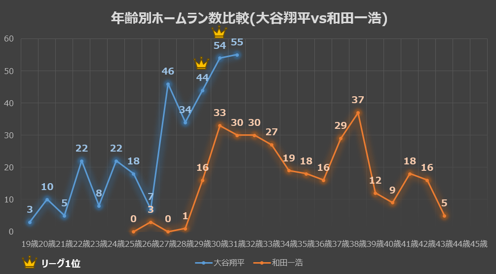 オレンジの折れ線(和田氏)を見ると、20代の頃はホームラン数が少なく(25歳で0本、28歳で1本、29歳で16本)、 本格的に量産し始めたのは30代に入ってから(30歳:33本)であることが一目でわかります。