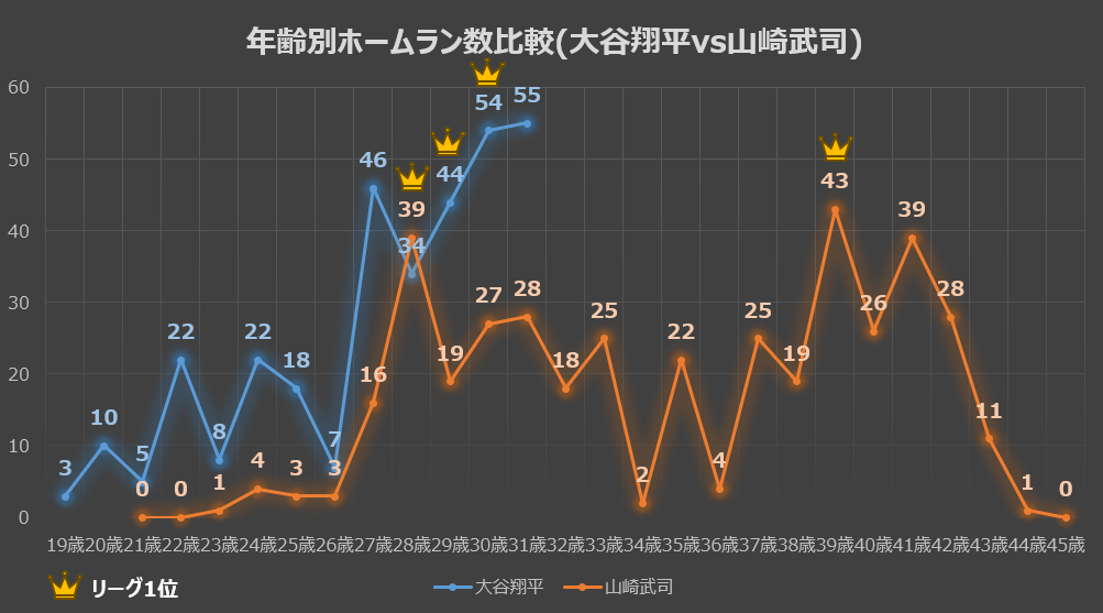 オレンジの折れ線(王氏)を見ると、まさに圧巻の一言です。22歳で初めてホームラン王(金色の王冠マーク)を獲得して以降、グラフの山が長年にわたって全く落ちていません。30代後半に差し掛かってもそのパワーは健在で、37歳で「50本」の大台に乗せ、なんと現役最終年である40歳でも「30本」を記録しています。これは、技術と自己管理次第で年齢の壁を越えられることを示す最高の証明です。