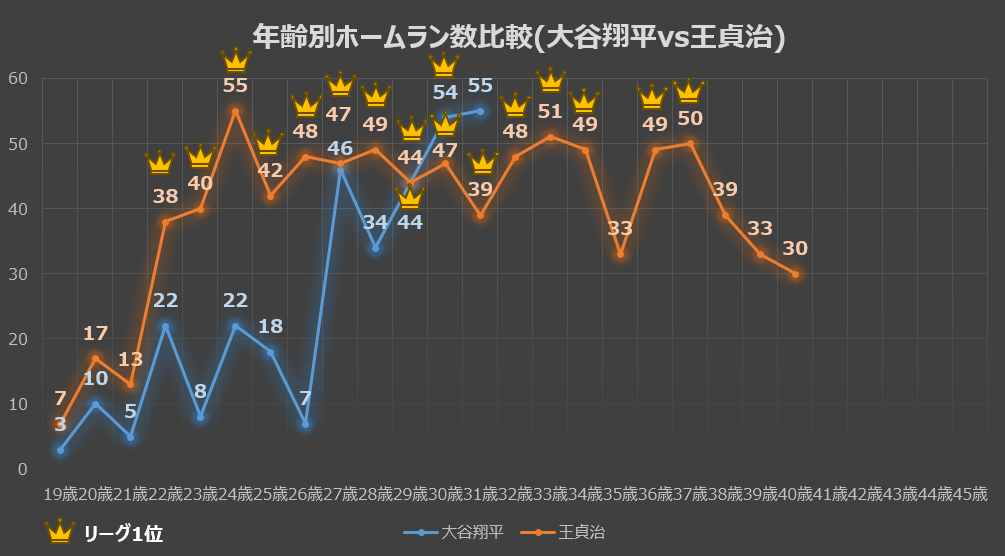 そして、このグラフには非常にドラマチックな「奇跡の一致」が隠されています。 大谷選手(青色の折れ線)が、メジャーリーグの舞台で念願のホームラン王に初めて輝いた「29歳」の年。なんとこの時、王氏も全く同じ「44本」のアーチを放ち、ホームラン王を獲得しているのです。時代も国も異なる二人の歴史的強打者が、同じ年齢で同じ本数を打ち、同じタイトルを手にしているという事実に、運命的なロマンを感じずにはいられません。
