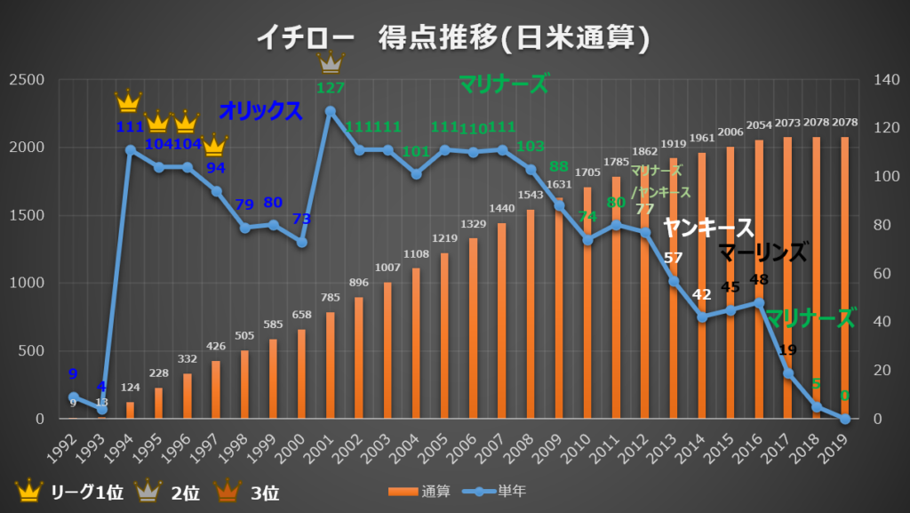 グラフを見ると、イチロー氏はメジャー移籍1年目(2001年)に「127得点」を記録してリーグトップに輝き、その後も8年連続で100得点以上をマーク。まさに理想のリードオフマンとして、日米通算2078得点という偉大な金字塔を打ち立てています。
