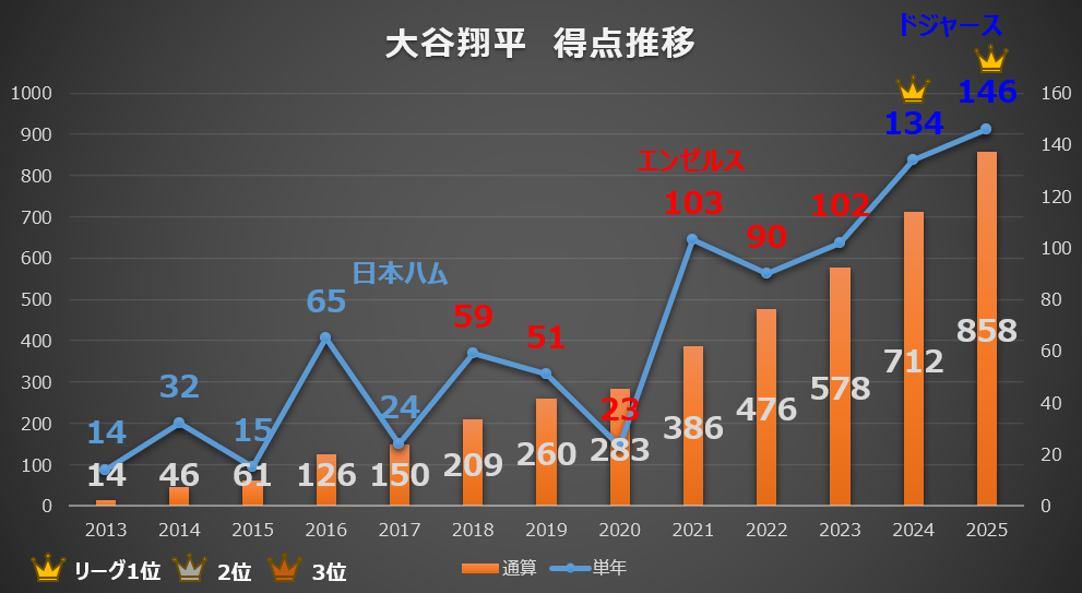 また、オレンジ色の棒グラフ(通算得点数)に注目すると、2025年終了時点で「日米通算858得点」に到達しています。勝利に直結する「得点」をこれほどのペースで量産し続けている事実は、大谷選手が最強のポイントゲッター(自ら決める打者)でありながら、同時に最強のチャンスメーカー(後続に還してもらう走者)でもあることを証明しています。