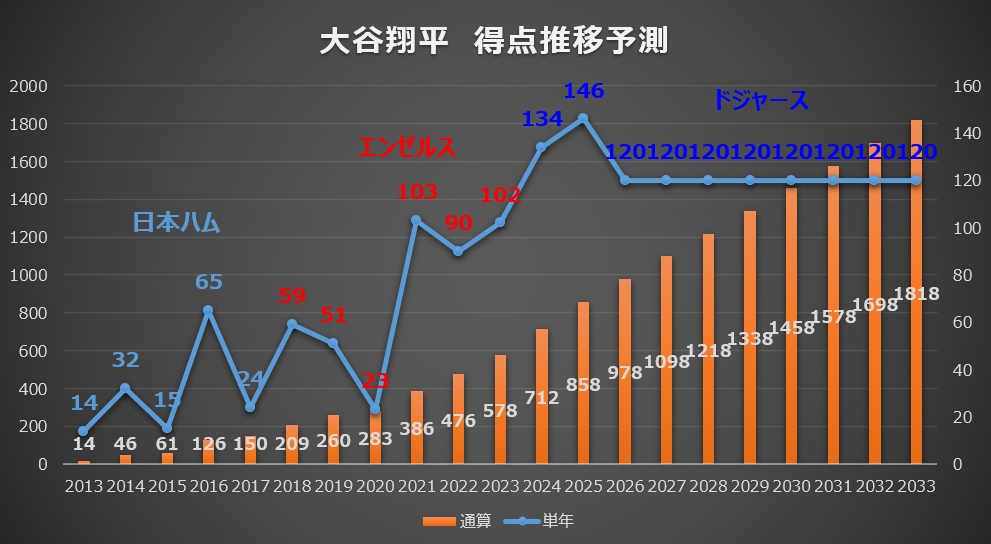 シミュレーションの結果、120得点のペースで得点を積み重ねた場合、40歳時点での日米通算得点数は1818得点に到達します。