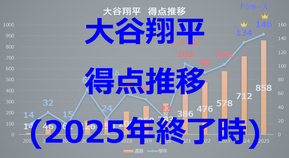 また、オレンジ色の棒グラフ(通算得点数)に注目すると、2025年終了時点で「日米通算858得点」に到達しています。勝利に直結する「得点」をこれほどのペースで量産し続けている事実は、大谷選手が最強のポイントゲッター(自ら決める打者)でありながら、同時に最強のチャンスメーカー(後続に還してもらう走者)でもあることを証明しています。