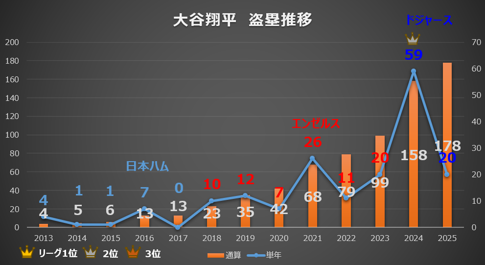 オレンジ色の棒グラフ(通算盗塁数)に目を向けると、2025年終了時点で「日米通算178盗塁」に到達しています。ホームラン王争いを繰り広げるメジャー最強の強打者が、同時にリーグ最多盗塁を記録するという、まさに漫画のような現実。大谷選手がいかに「規格外のスピードと高い走塁技術」を兼ね備えた唯一無二のアスリートであるかが、このデータから克明に読み取れます。