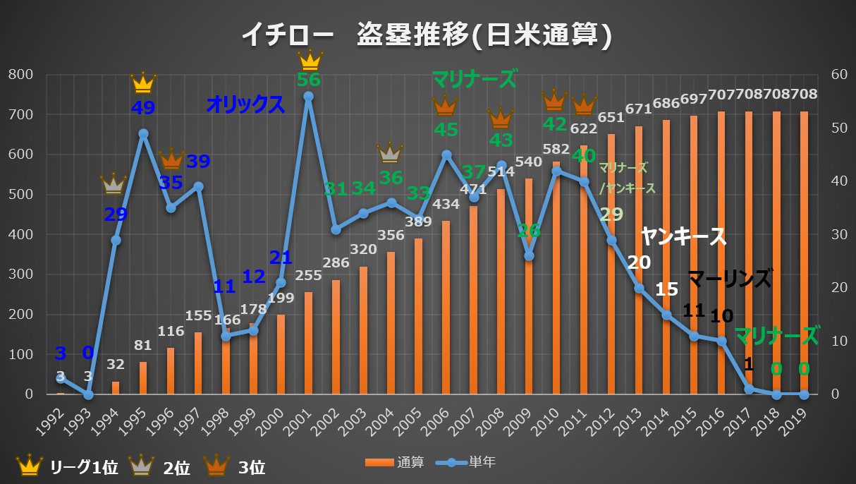 グラフを見ると、イチロー氏はメジャー移籍1年目の2001年に自己最多となる「56盗塁」でいきなり盗塁王を獲得。その後もコンスタントに走り続け、日米通算708盗塁という圧倒的な金字塔を打ち立てています。