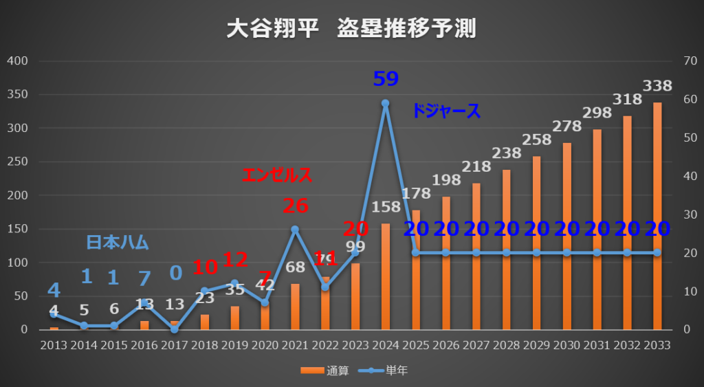 シミュレーションの結果、20盗塁のペースで得点を積み重ねた場合、40歳時点での日米通算盗塁数は338盗塁に到達します。