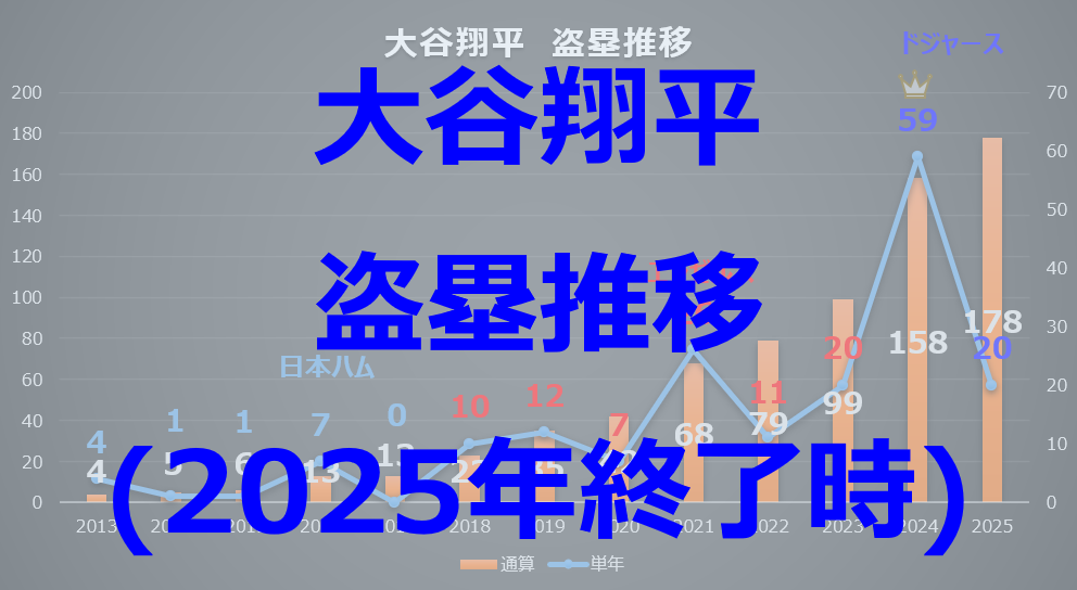 オレンジ色の棒グラフ(通算盗塁数)に目を向けると、2025年終了時点で「日米通算178盗塁」に到達しています。ホームラン王争いを繰り広げるメジャー最強の強打者が、同時にリーグ最多盗塁を記録するという、まさに漫画のような現実。大谷選手がいかに「規格外のスピードと高い走塁技術」を兼ね備えた唯一無二のアスリートであるかが、このデータから克明に読み取れます。