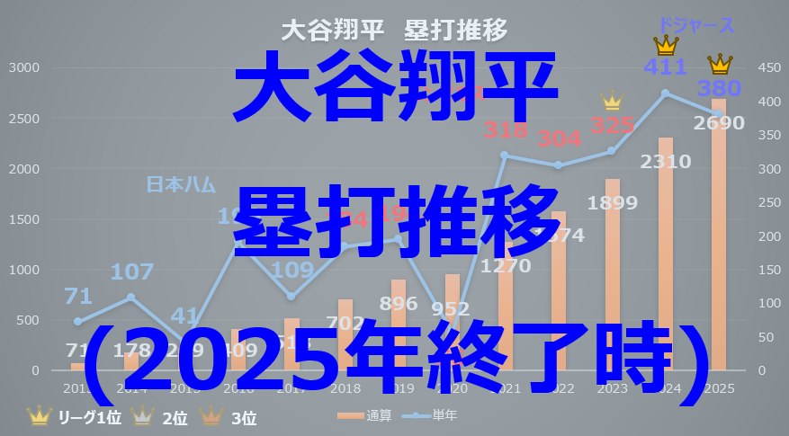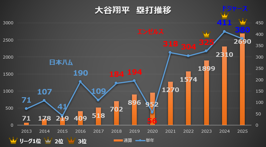 また、オレンジ色の棒グラフ(通算塁打数)に注目すると、2025年終了時点で「日米通算2690塁打」に到達。年々その積み上げペースは加速しており、大谷選手がいかにコンスタントに長打を放ち、相手チームに脅威を与え続けているかがこのデータから克明に読み取れます。