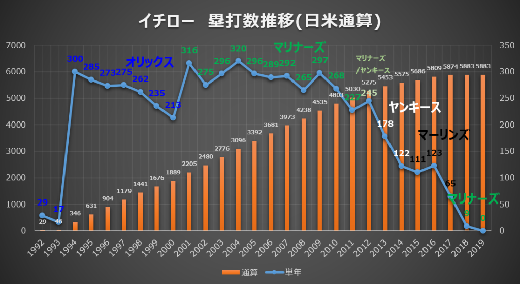 この「通算5490塁打」という数字は、最強の長距離砲である松井秀喜氏の日米通算記録(4714塁打)を遥かに超え、あのイチロー氏がヒットの山を築いて到達した大記録(5854塁打)にも迫る、とてつもない領域です。