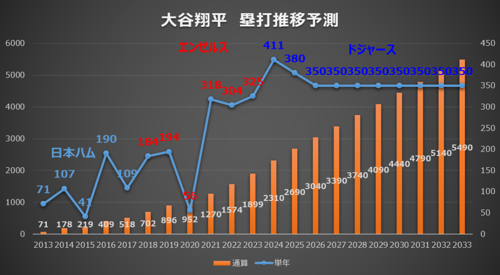 では、大谷選手がドジャースとの10年契約が満了する「40歳(2033年)」まで現役を続けた場合、通算の記録はどこまで伸びるのでしょうか?