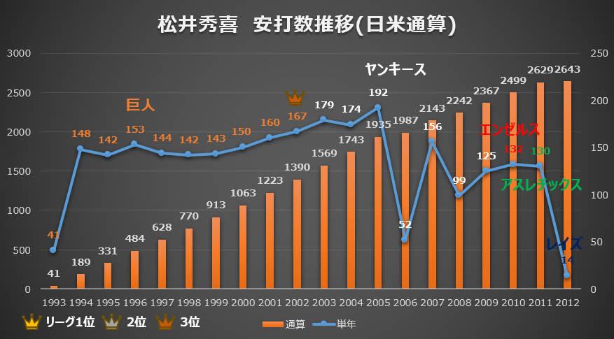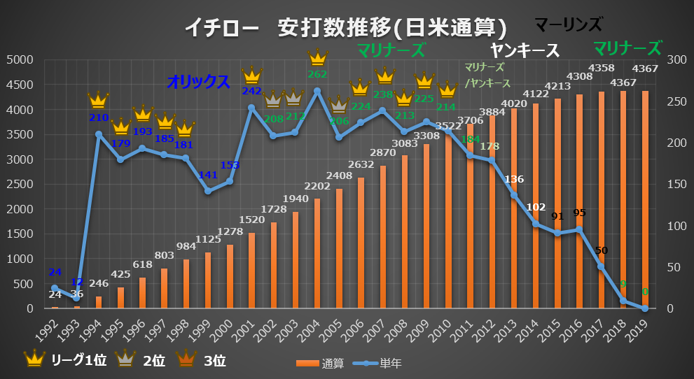 まずは、プロ入りから現在に至るまでの日米通算の安打数推移(単年・通算)をグラフで見てみましょう。
