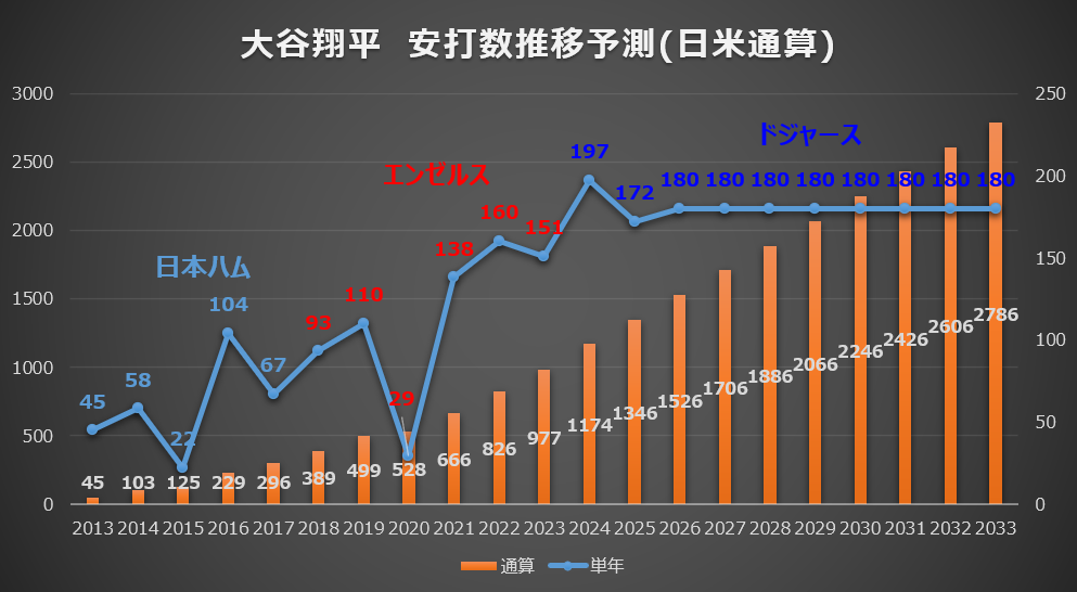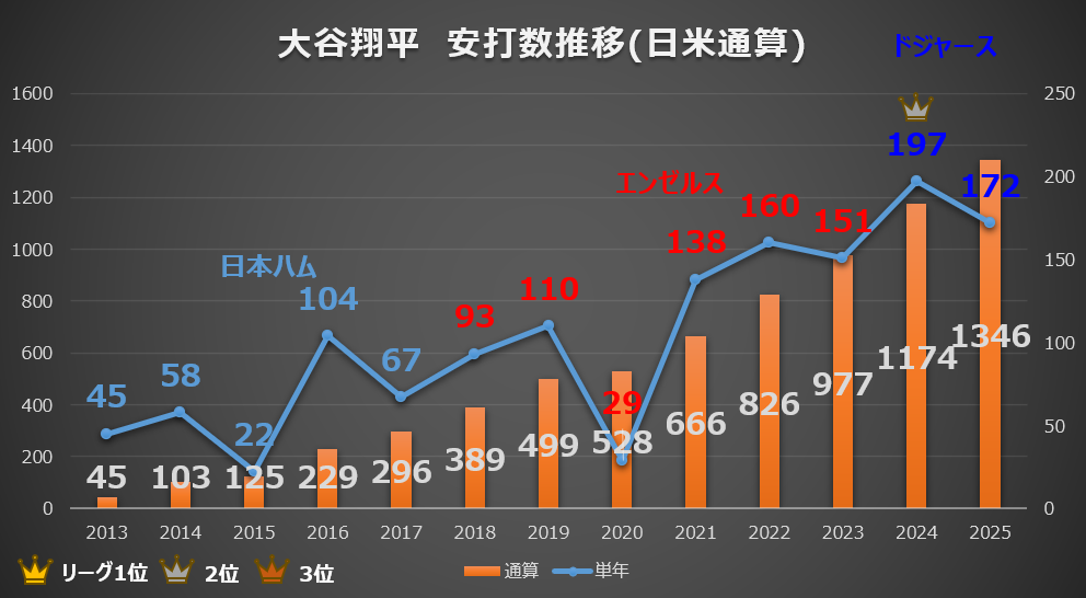 グラフの青い折れ線(単年安打数)を見ると、大谷選手が単なる「一発を狙うバッター」ではなく、確実にヒットを量産する「ヒットメーカー」として恐ろしいほどの進化を遂げていることが一目でわかります。