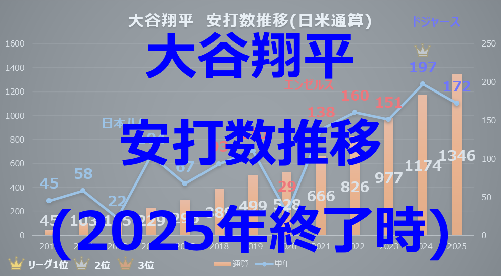 また、オレンジ色の棒グラフ(通算安打数)に注目すると、近年の爆発的な量産ペースによって、2025年終了時点で「日米通算1346安打」に到達しています。 プロ野球選手の一つの大きな勲章であり、名球会入りの条件でもある「通算2000本安打」という大記録すらも、すっかり現実的な目標として視界に入ってきました。