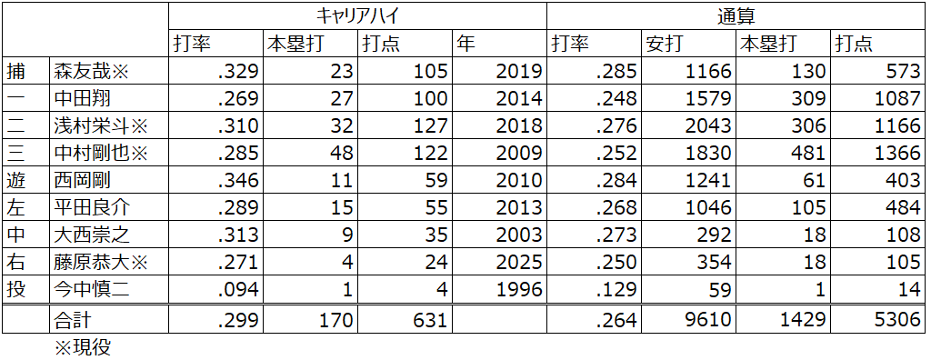 また、森友哉選手や浅村選手、藤原恭大選手など、現役バリバリで活躍している選手が数多く名を連ねているのも特徴です。彼らの通算成績は今この瞬間も積み上がっており、このベストメンバーの「チーム通算成績」は今後さらに恐ろしい数字へと進化していくことでしょう。