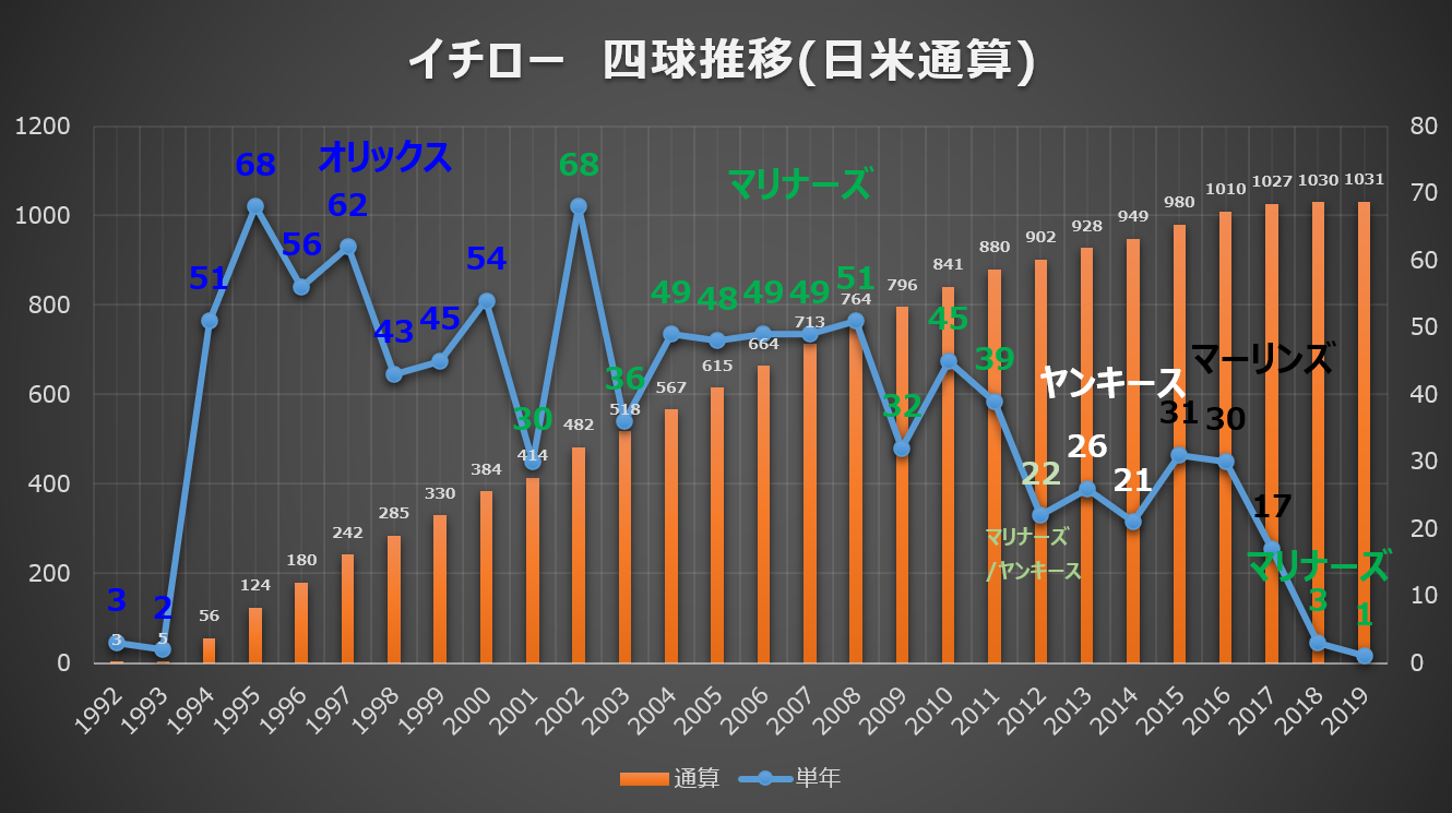 グラフを見ると、両レジェンドのスタイルの違いが四球数にもはっきりと表れています。 イチロー氏は、日米通算で多くの四球(棒グラフ)を記録していますが、単年での最高は2004年の60四球。これは、彼が「ヒットを打つ」ことで出塁するスタイルであり、相手バッテリーも「歩かせる」より「勝負する」ことを選んだ結果と言えます。