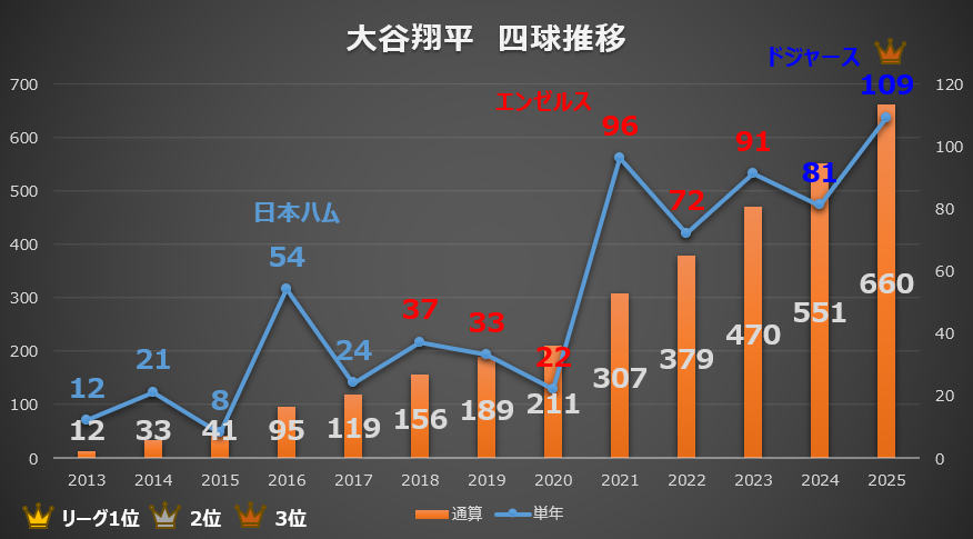 オレンジ色の棒グラフ(通算四球数)に目を向けると、2025年終了時点で「日米通算660四球」に到達しています。「打たせない」のではなく「打たれるのが怖くて勝負を避けられる」。この四球の山こそが、現在の大谷選手がメジャーリーグ全体からどれほど恐れられている存在なのかを、何よりもリアルに物語っています。