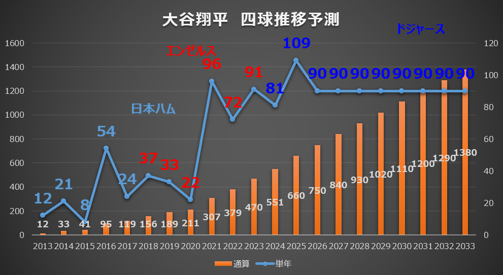 では、大谷選手がドジャースとの10年契約が満了する「40歳(2033年)」まで現役を続けた場合、通算の記録はどこまで伸びるのでしょうか?