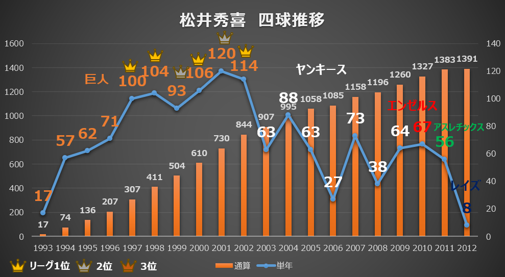 一方の松井氏は、巨人時代の2001年に自己最多となる「120四球」を記録。メジャー移籍後も、強力な主軸打者として常に高い警戒心(多くの四球)を向けられていたことがわかります。