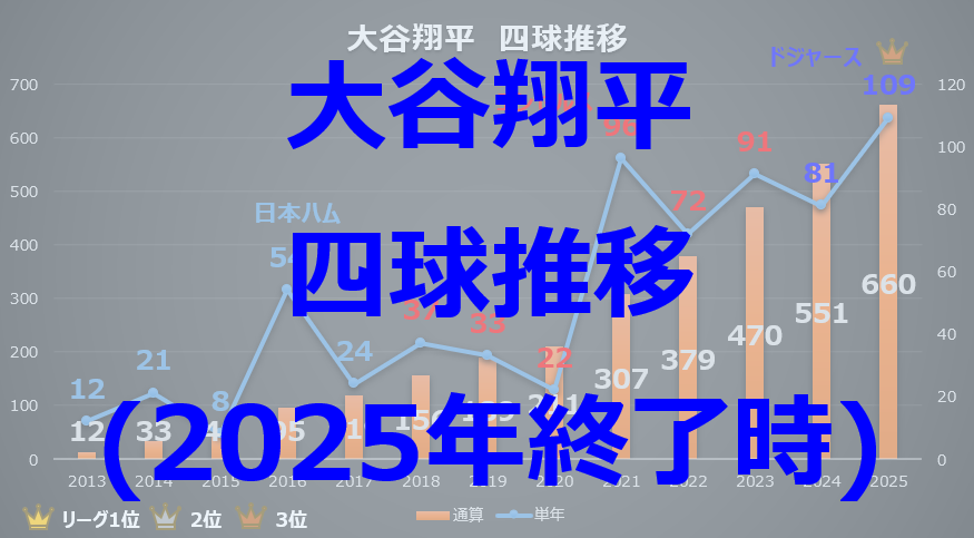 オレンジ色の棒グラフ(通算四球数)に目を向けると、2025年終了時点で「日米通算660四球」に到達しています。「打たせない」のではなく「打たれるのが怖くて勝負を避けられる」。この四球の山こそが、現在の大谷選手がメジャーリーグ全体からどれほど恐れられている存在なのかを、何よりもリアルに物語っています。
